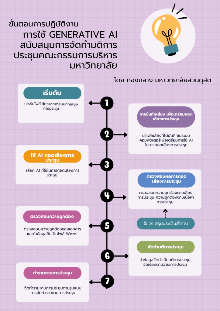 คณะทำงานการจัดการความรู้ กองกลาง สำนักงานมหาวิทยาลัย มหาวิทยาลัยสวนดุสิต นำโดย นางสาวปัทมา ลักษณะโยธิน นางสาววรรณลักษณ์ โพธิ์น้อย นายปราการ รอดปรีชา และดร.ณัฐพล แย้มฉิม ได้นำเสนอหัวข้อการจัดการความรู้ คือ “การประยุกต์ใช้ Generative AI สนับสนุนการจัดทำมติการประชุมคณะกรรมการบริหารมหาวิทยาลัย”