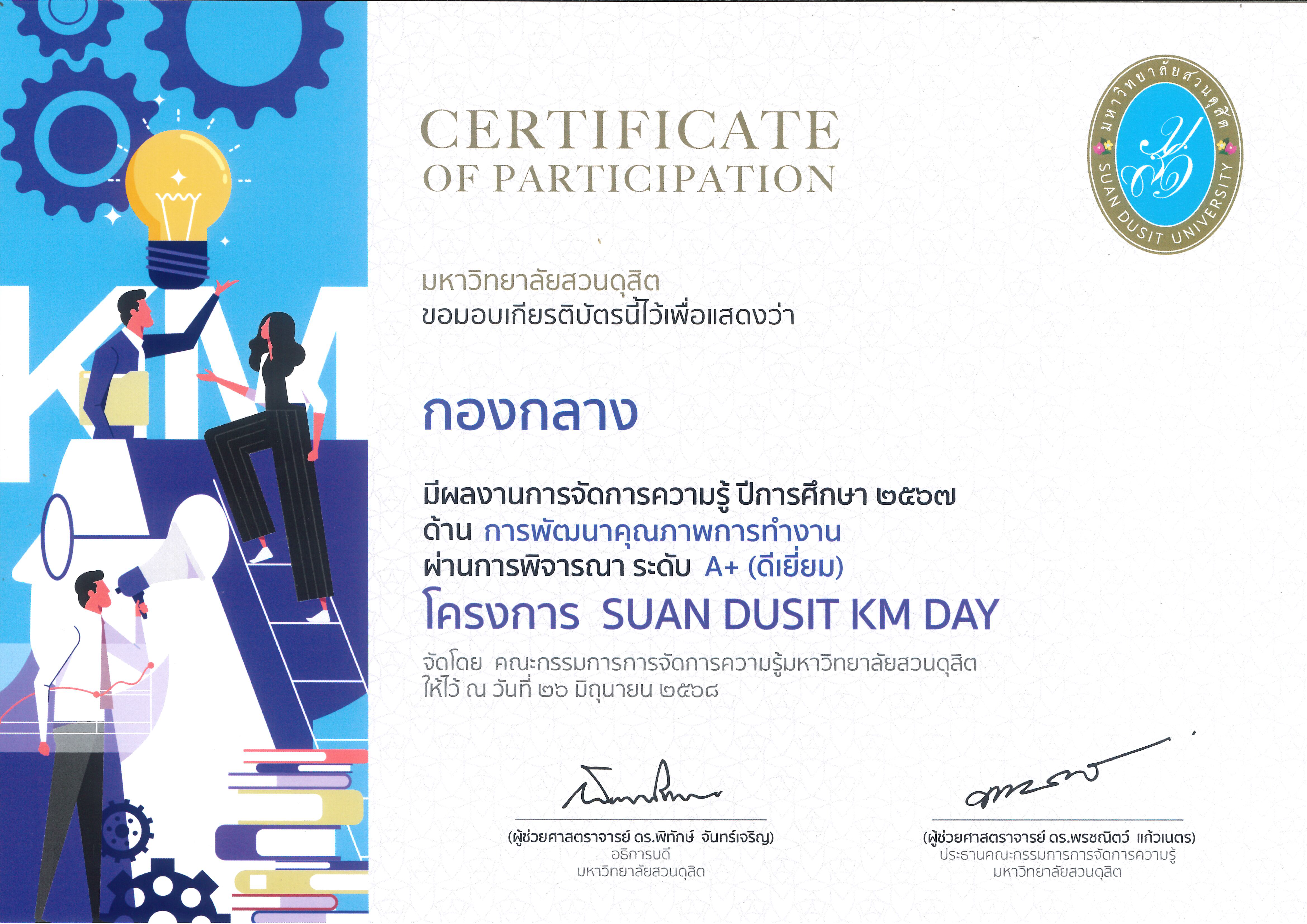 กองกลาง สำนักงานมหาวิทยาลัย มหาวิทยาลัยสวนดุสิต ได้รับเกียรติบัตรเพื่อแสดงว่า “กองกลาง” มีผลงานการจัดการความรู้ ปีการศึกษา 2567 ด้านการพัฒนาคุณภาพการทำงาน ผ่านการพิจารณา ระดับ A+ (ดีเยี่ยม) โครงการ SUAN DUSIT KM DAY