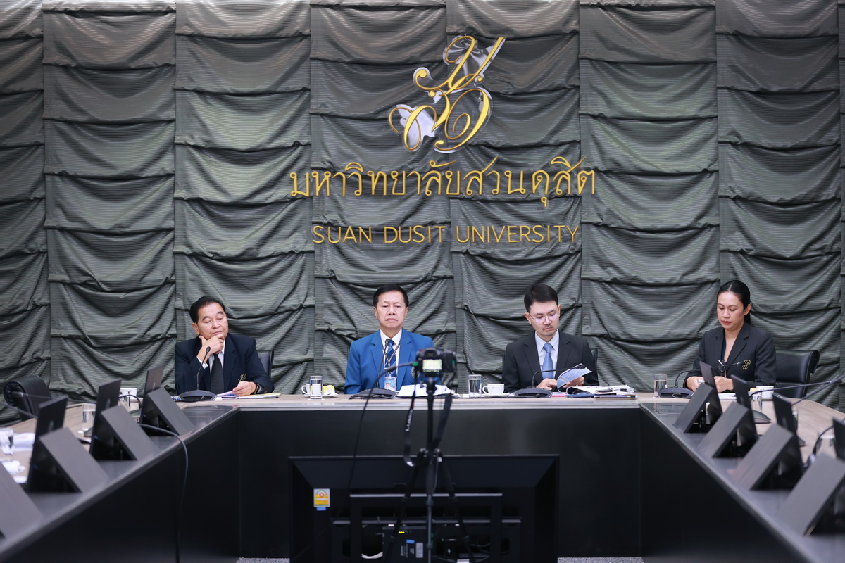 ผู้ช่วยศาสตราจารย์ ดร.พิทักษ์ จันทร์เจริญ อธิการบดี รองศาสตราจารย์ ดร.สุขุม เฉลยทรัพย์ ประธานที่ปรึกษาอธิการบดี รองศาสตราจารย์ ดร.ชนะศึก นิชานนท์ รองอธิการบดีฝ่ายบริหาร วิจัย และนวัตกรรม ดร.สุวิชชา เนียมสอน ผู้ช่วยอธิการบดีฝ่ายการพัฒนาคุณภาพสู่ความเป็นเลิศ และผู้บริหารมหาวิทยาลัยสวนดุสิต เข้าร่วมประชุมชี้แจงงบประมาณรายจ่าย ประจำปี งบประมาณ พ.ศ. 2569 ต่อคณะกรรมาธิการวิสามัญฯ สภาผู้แทนราษฎร ณ ห้องประชุมศาลาชื่นอารมณ์ และออนไลน์ผ่าน วันที่ 7 กรกฎาคม 2568