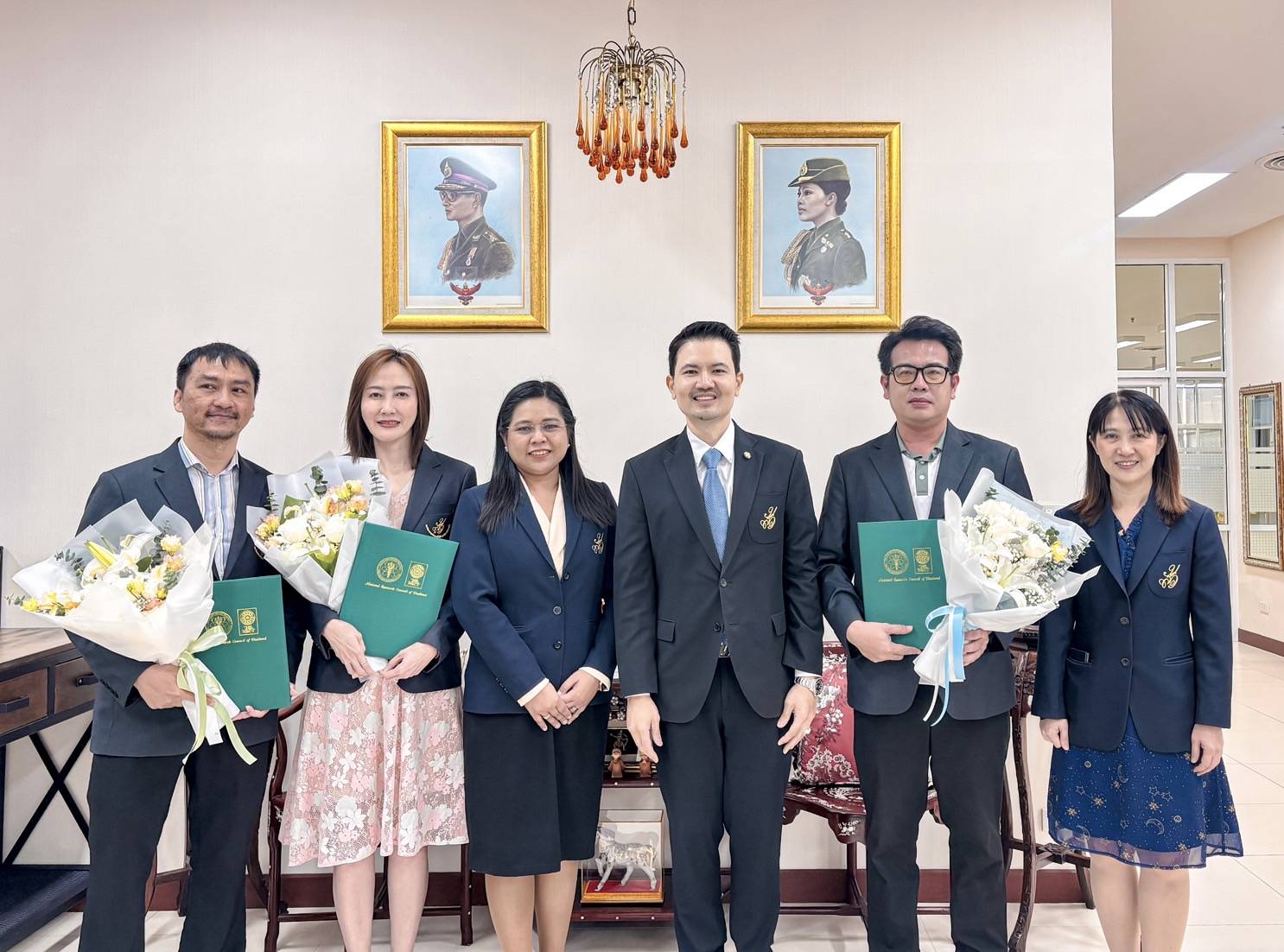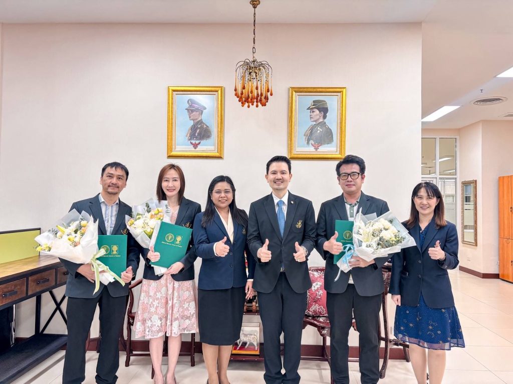 รองอธิการบดี ฝ่ายบริหาร วิจัย และนวัตกรรม มหาวิทยาลัยสวนดุสิต แสดงความยินดีกับอาจารย์นักวิจัยที่เข้ารับประกาศนียบัตรจากสำนักงานการวิจัยแห่งชาติ (วช.)