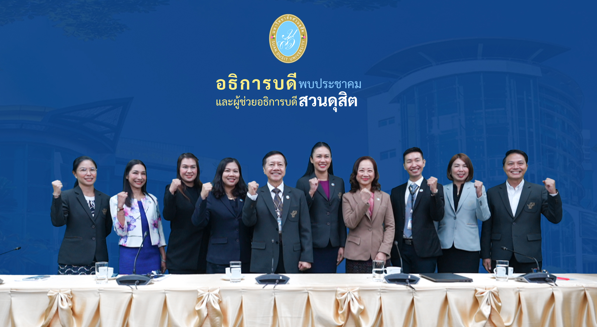 ผู้ช่วยศาสตราจารย์ ดร.พิทักษ์ จันทร์เจริญ อธิการบดีมหาวิทยาลัยสวนดุสิต พร้อมด้วย ผู้ช่วยอธิการบดี ดร.สุวิชชา เนียมสอน ผู้ช่วยอธิการบดีฝ่ายการพัฒนาคุณภาพสู่ความเป็นเป็นเลิศ ผศ.ดร.กนกกานต์ วีระกูล ผู้ช่วยอธิการบดีฝ่ายการพัฒนาวิชาชีพและการบูรณาการพันธกิจ ดร.พันธรักษ์ ผูกพันธ์ ผู้ช่วยอธิการบดีฝ่ายพัฒนาการเรียนการสอนสู่สากล ผศ.ดร.ดวงเนตร ธรรมกุล ผู้ช่วยอธิการบดีฝ่ายพัฒนานวัตกรรม ผศ.ขวัญหทัย เชิดชู ผู้ช่วยอธิการบดีฝ่ายการพัฒนานักศึกษาสู่ความเลิศ ดร.อนุชา แข่งขัน ผู้ช่วยอธิการบดีฝ่ายการพัฒนาองค์กรและพันธกิจสัมพันธ์ ดร.กัญญูทอง หรดาล ผู้ช่วยอธิการบดีฝ่ายบริหารการศึกษาเชิงยุทธศาสตร์เพื่อความยั่งยืน พบประชาคมสวนดุสิต ในโอกาสเข้ารับตำแหน่งใหม่ พร้อมนำเสนอแนวทางและนโยบายการดำเนินงานในอนาคต เมื่อวันพุธที่ 16 กรกฎาคม 2568 เวลา 10.00 – 11.30 น. Online ผ่านระบบ SDU Web Conference